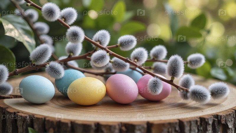 Праздничные пасхальные яйца с ветвями ивы на деревянном ломтике