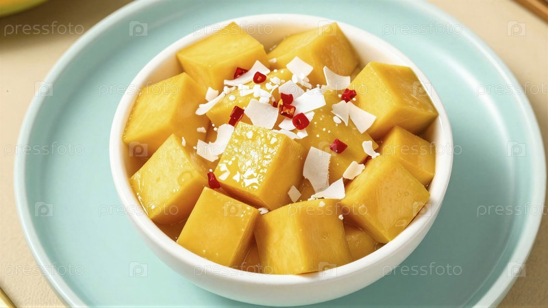 Сладкий манговый десерт с кокосовыми хлопьями