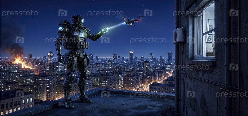 Роботизированный хранитель с видом на городской пейзаж в сумерках
