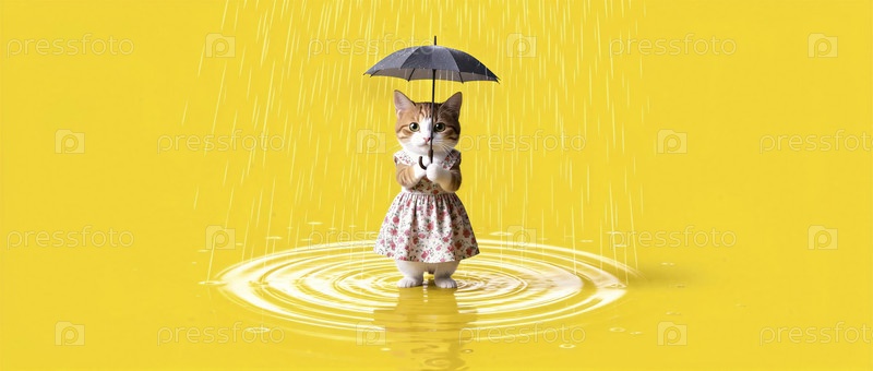 Кошка в дожде с зонтиком, желтый фон, Счастье, радость