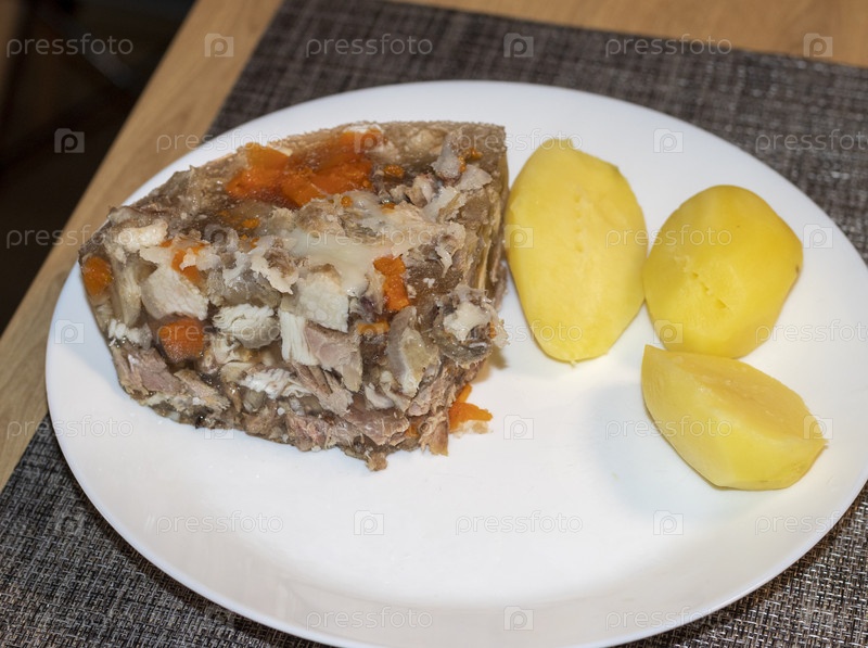 Ближайший снимок аспика и домашнего печеного картофеля. еда