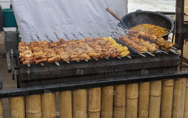 Шашлик - популярное блюдо из скошенного и жареного мяса, происходящее от кочевых групп на Кавказе и в Центральной Азии