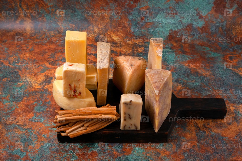 Различные типы твердых и полутвердых сыров с различными добавками на черной деревянной доске