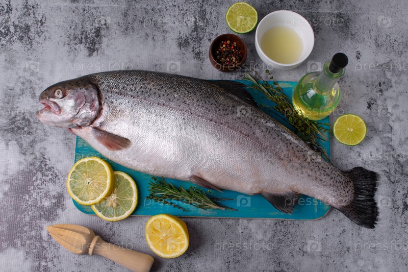 Свежая всякая радужная форель, растительное масло, перцы, лимон, лайм и травы на сером фоне