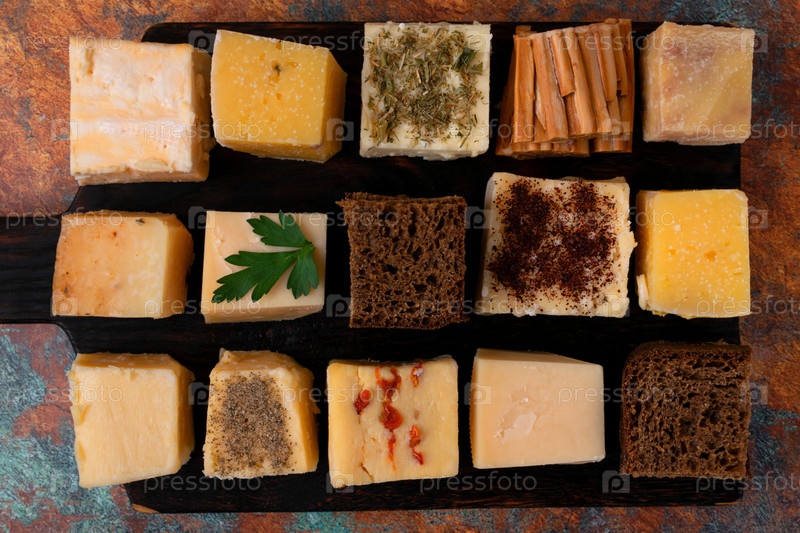 Ассортимент твердых и полутвердых сыров с различными добавками, ржаной хлеб, подаваемый разрезанным в большие кубики на черном деревянном доске. Идея для презентации или дегустации. Вид сверху. Близкий снимок