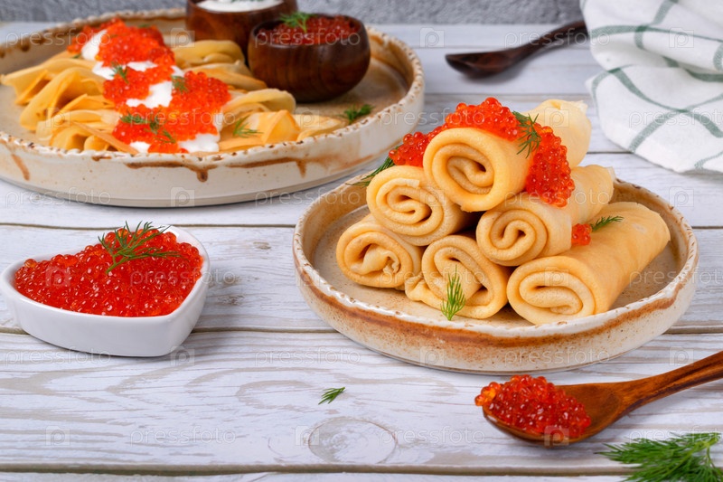 Традиционные русские тонкие крепежи с красной икры на керамической тарелке на белом фоне. праздничное блюдо для Масленицы