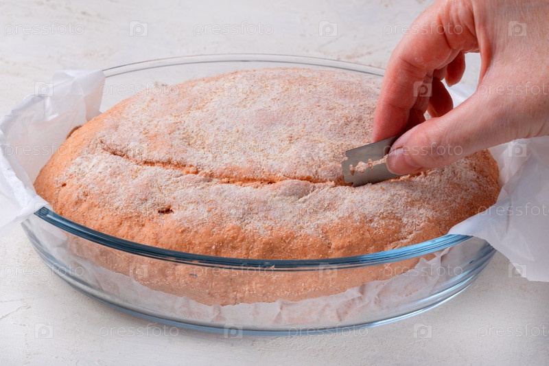 Проверка томатного хлеба с кислым тестом и резки бритвой для хорошей формы на белом столе