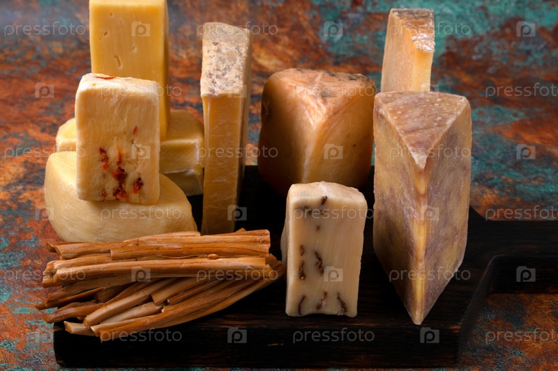 Выбор твердых и полутвердых сыров с различными начинками на черной деревянной доске. Идея презентации продукта. Близкий план