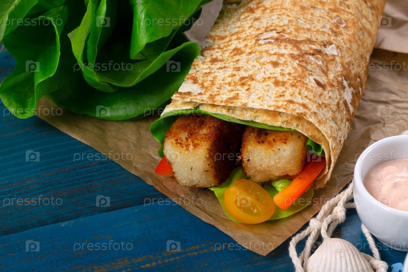 Рыбий ролик в лаваш на синем фоне