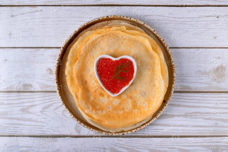 Традиционные русские тонкие блины (крепежи) и сердцеобразная красная икра на белом фоне. праздничное блюдо для Масленицы или Дня святого Валентина. вид сверху