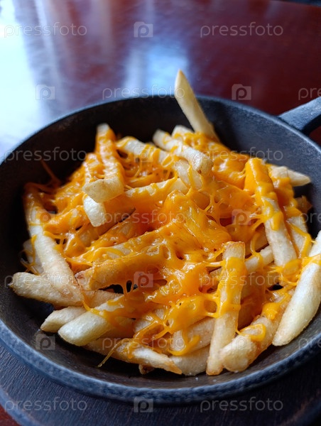 Свежеприготовленные картофель фри, испеченный с сыром чеддар в чугунной сковороде