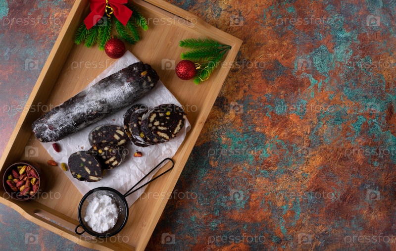 Шоколадный десерт салями без выпечки из разбитых печенья с фисташками, сосновыми орехами и сушеными клюквами в деревянной коробке