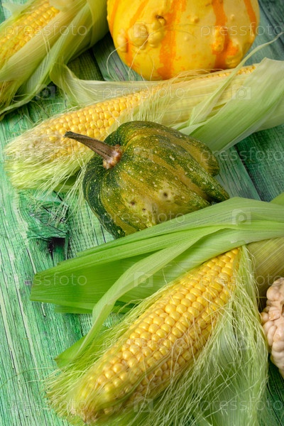 Кукурузные хлопья, частично очищенные от кожуры, показывают ярко-желтые ядра и бородатые тыквы на зеленом деревянном фоне