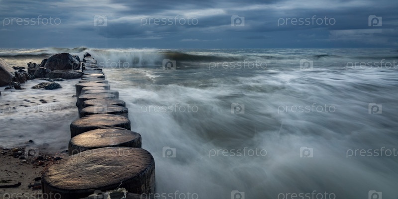 Валуны и деревянные водохранилища на пляже