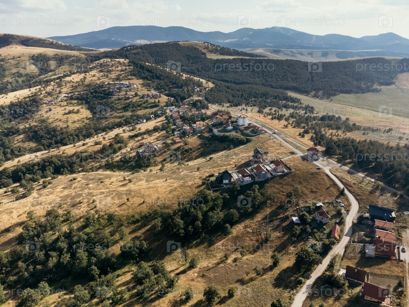 Вид с воздуха на высокогорье Златибор, деревню с лесистыми холмами и разбросанными домами летом