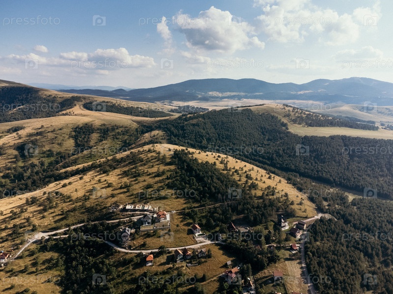 Вид с воздуха горы, озера, лыжного лифта и курорта, Златибор, Сербия, Европа