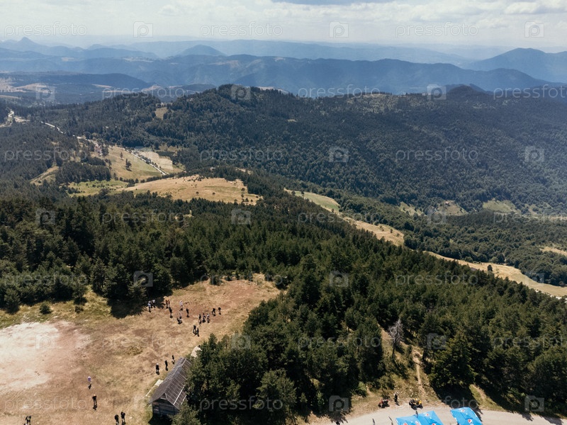 Вид с воздуха на высокогорье Златибор, деревню с лесистыми холмами и разбросанными домами летом