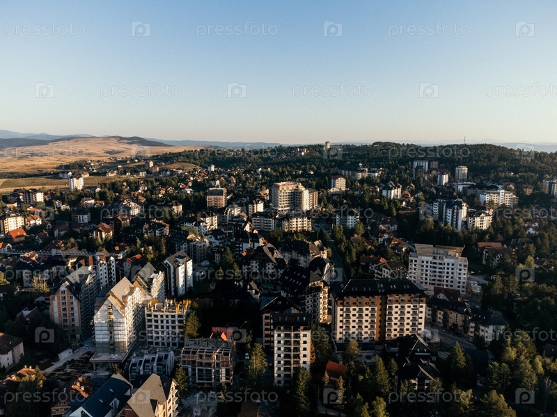 Вид с воздуха небольшого горного города Златибор недалеко от горнолыжного курорта, Сербия, Европа
