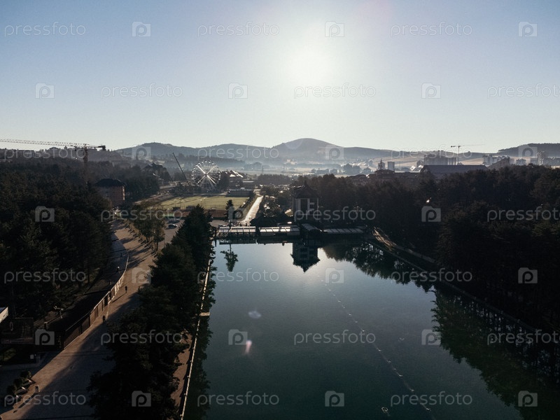 Вид с воздуха горы, озера, лыжного лифта и курорта, Златибор, Сербия, Европа