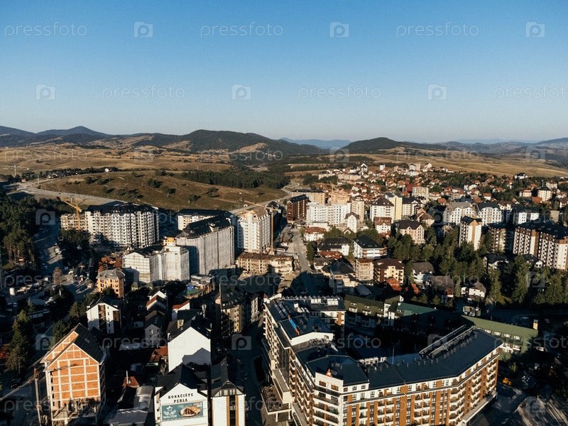 Вид с воздуха горы, озера, лыжного лифта и курорта, Златибор, Сербия, Европа