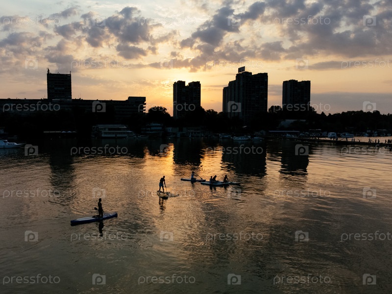Падлебоардеры и байкеры плывут по реке Саве при закате солнца с белоградским горизонтом на заднем плане