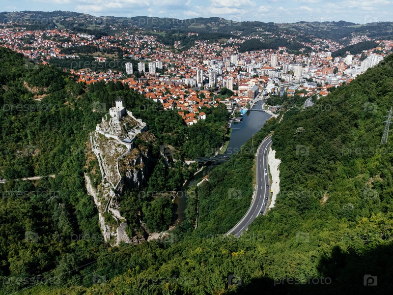 Вид с воздуха города Узице в западной Сербии с рекой, современными зданиями и окружающими зелеными холмами