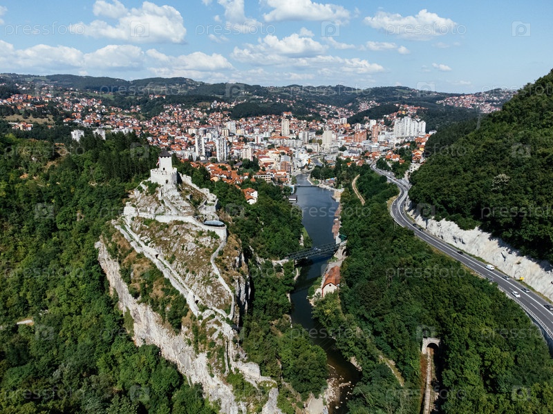 Вид с воздуха города Узице в западной Сербии с рекой, современными зданиями и окружающими зелеными холмами