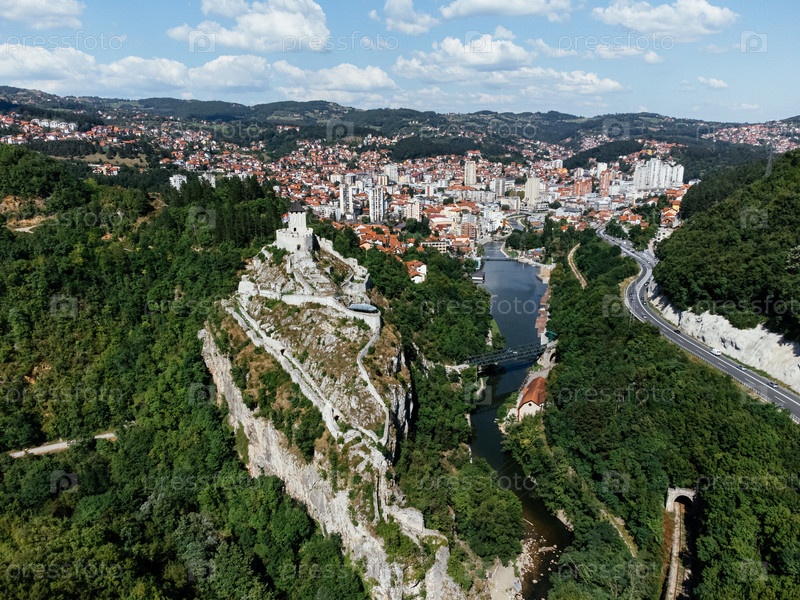 Вид с воздуха города Узице в западной Сербии с рекой, современными зданиями и окружающими зелеными холмами