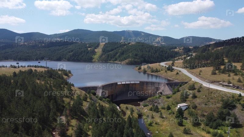 Вид с воздуха плотины и озера Златибор в Сербии, окруженный лесистыми холмами и извилистыми дорогами