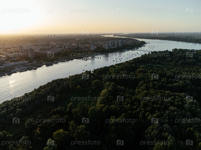 Вид с воздуха на берег реки с лодками и горизонтом города в золотое время суток