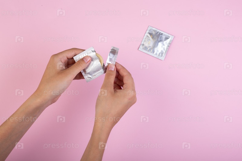 Женская рука, держащая презерватив на розовом фоне