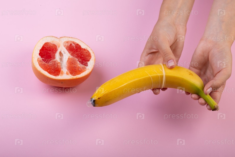 Женская рука положила презерватив на банан на розовом фоне