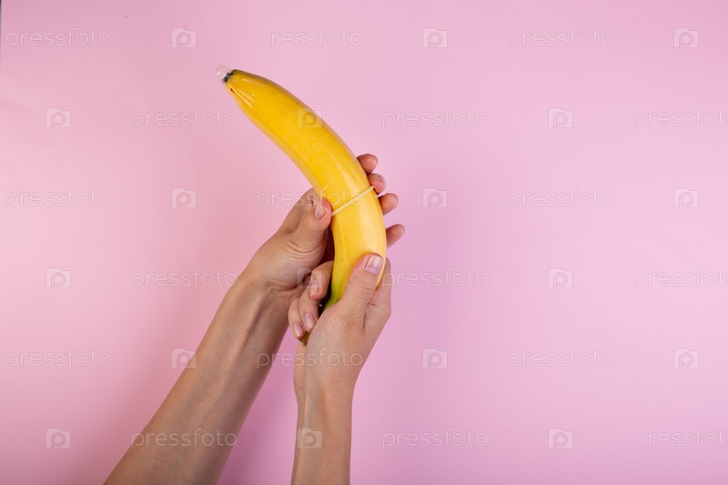 Женская рука положила презерватив на банан на розовом фоне