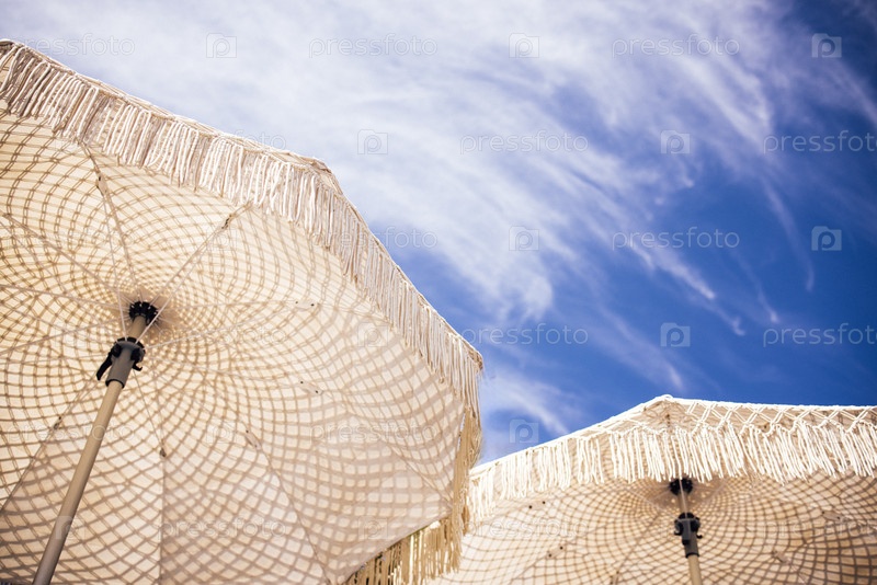 Декоративные белые пляжные зонтики с красками против ярко-синего неба, демонстрирующие сложные узоры и текстуры, идеально подходят для летних каникул и отдыха на открытом воздухе