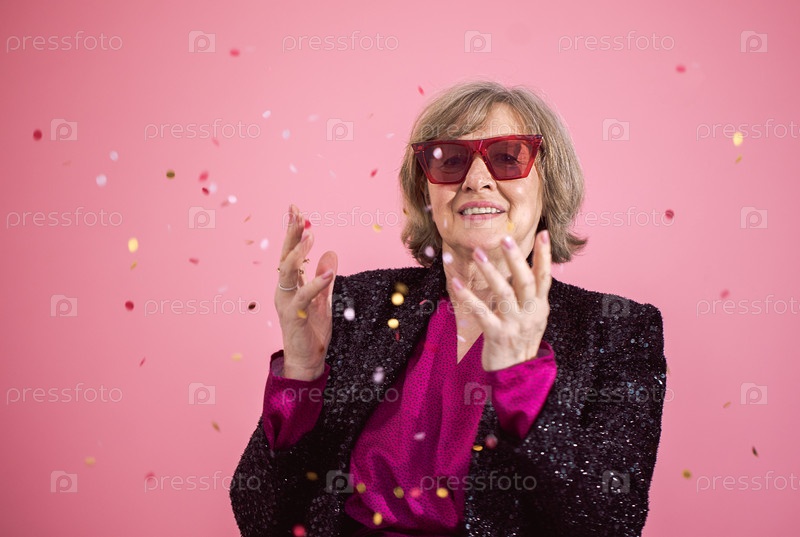 Пожилая женщина с седыми волосами, одетая в розовые солнцезащитные очки и черное платье из полотен, радостно бросает красочные конфетти на розовом фоне в праздничной обстановке