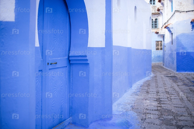 Голубоокрашенная дверь в узком переулке традиционного марокканского города с белыми стенами и мощеным тротуаром, создает яркую архитектурную сцену