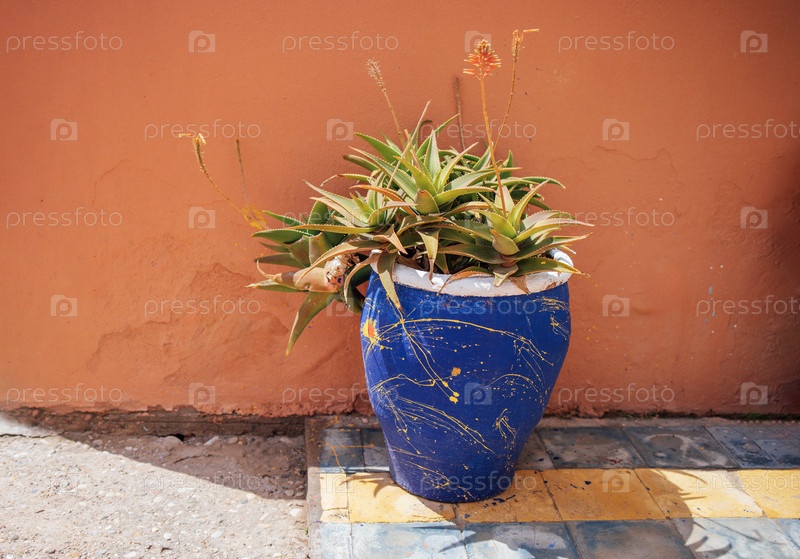 В горшке сочное растение в голубом декоративном горшочке с желтыми и белыми пятнами краски на оранжевой стене, демонстрируя яркие цвета и текстуры в солнечной наружной обстановке