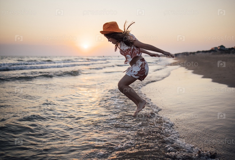 Молодая девушка в цветочном платье и оранжевой шляпе игриво прыгает на берегу во время заката, с мягкими волнами, лапающими ее ноги и красочным небом на заднем плане