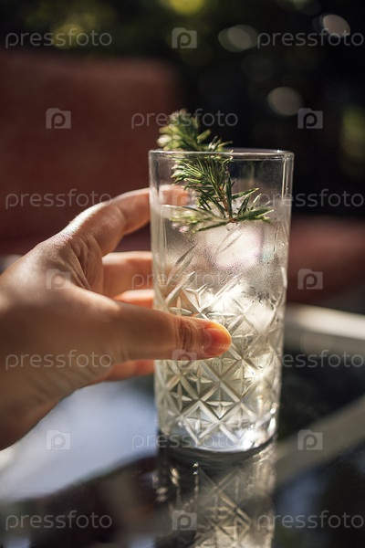 Рука держит высокий стакан освежающего коктейля с льдом и веточкой можжевельника, размещенный на стеклянном столе в наружной обстановке с размытым фоном