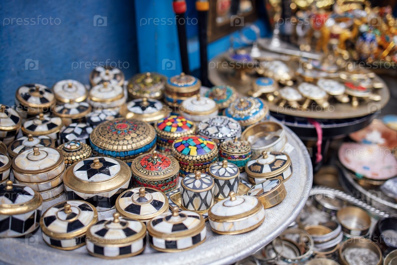 Декоративные коробки ручной работы со сложными рисунками, выставленные на серебряной подносе на рынке, демонстрируют яркие цвета и детальное мастерство