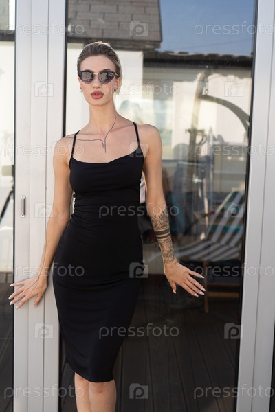 Молодая красивая женщина позирует в черном коротком платье снаружи