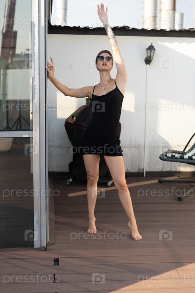Молодая красивая женщина позирует в черном коротком платье снаружи