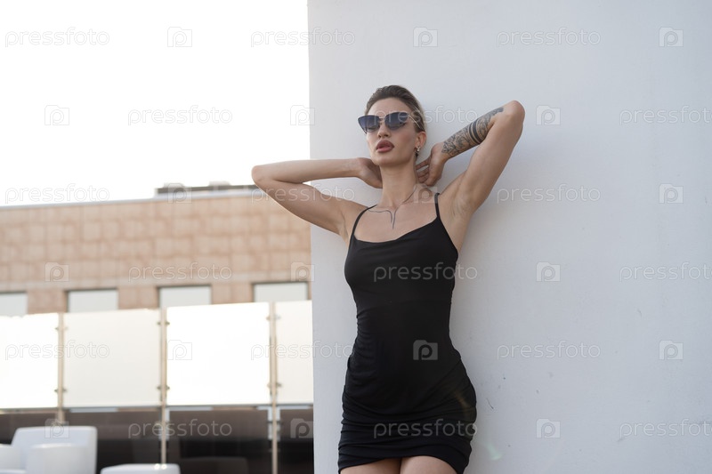 Молодая красивая женщина позирует в черном коротком платье снаружи