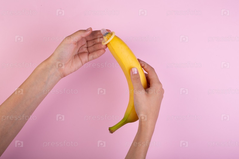Женская рука положила презерватив на банан на розовом фоне