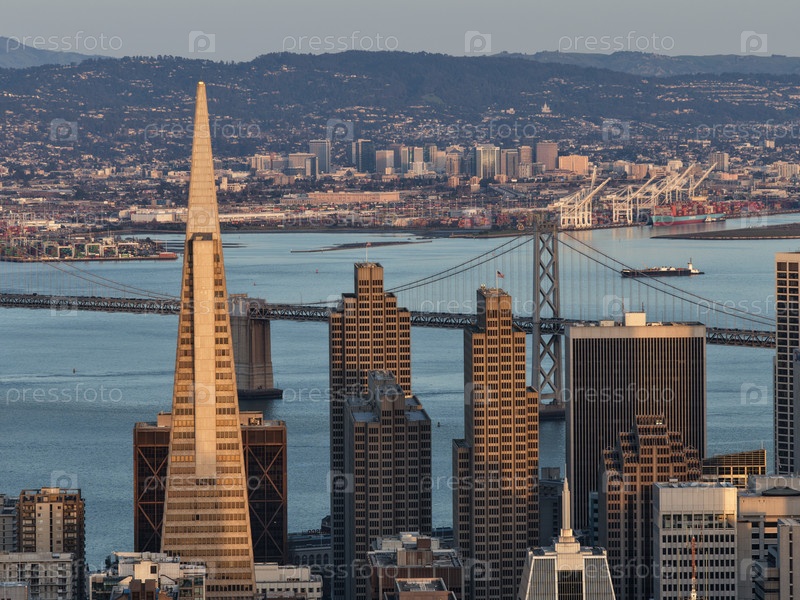 Горизонт Сан-Франциско с мостом Оукленд Бэй и Трансамериканской пирамидой на закате