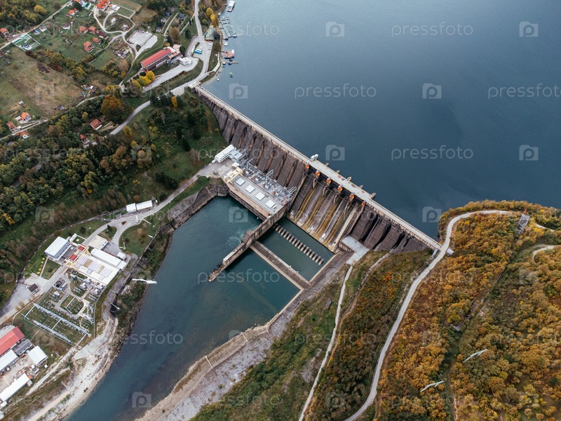 Вид с воздуха плотины Перукац на реке Дрине недалеко от национального парка Тара в Сербии, окруженный осенним лесом