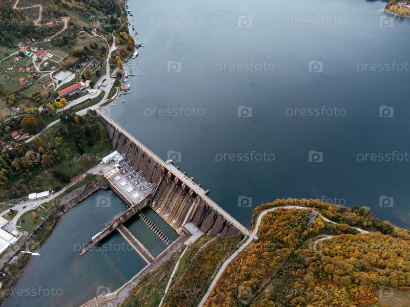 Вид с воздуха плотины Перукац на реке Дрине недалеко от национального парка Тара в Сербии, окруженный осенним лесом