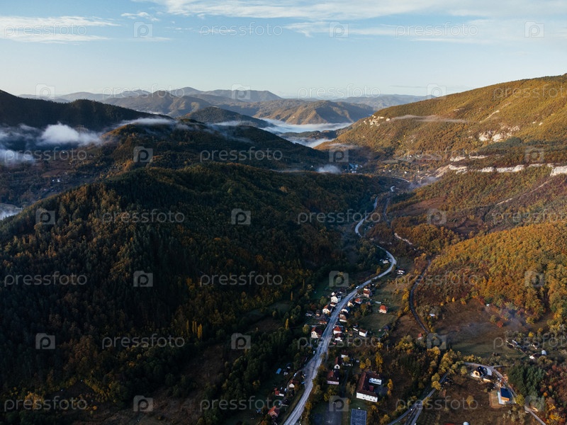 Вид с воздуха на горы Тара в Сербии с осенним лесом, сельской долиной и утренним туманом