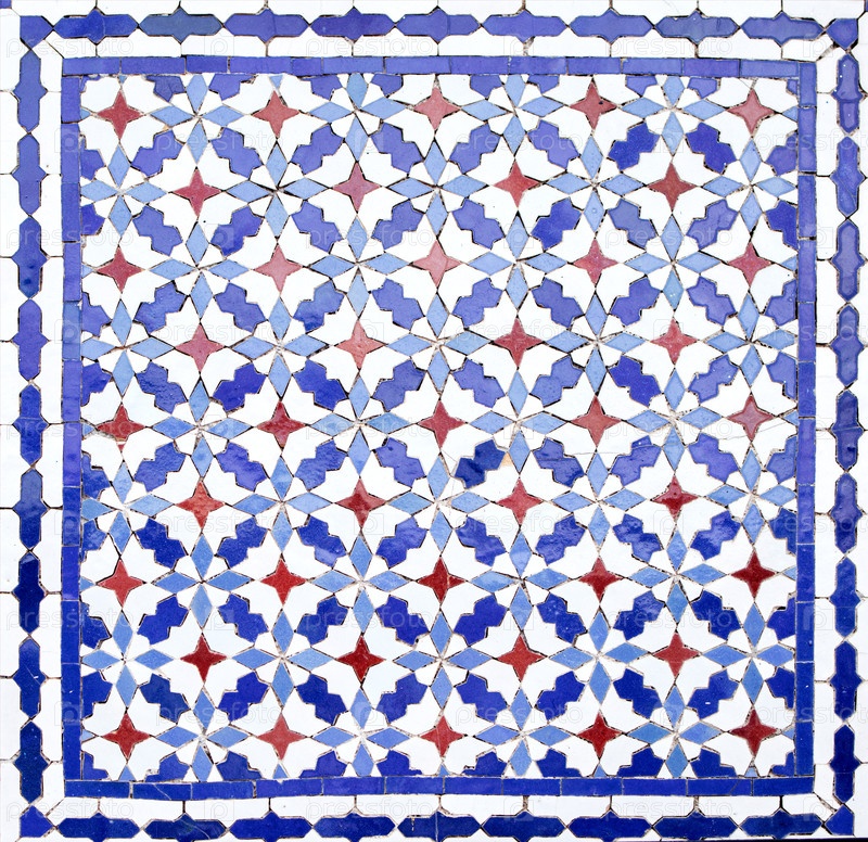 Геометрический шаблон плитки с синим, белым и красным цветами, расположенными в сложных звездных формах, создает визуально поразительный дизайн, подходящий для различных декоративных приложений