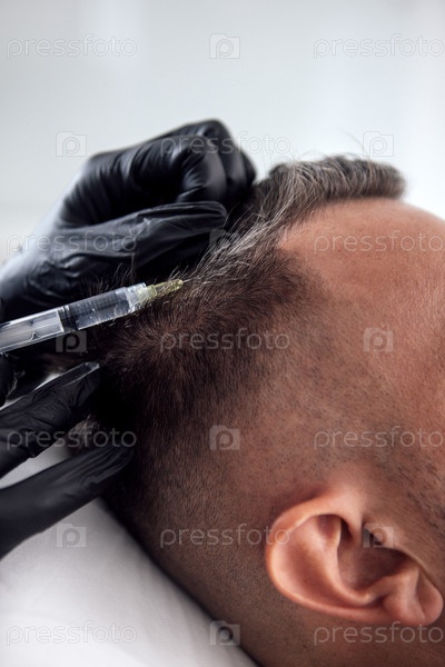 Пациент-мужчина, получающий лечение восстановления волос с помощью шприца в современной клинике, демонстрируя передовые методы возобновления роста и омоложения волос в клинической обстановке